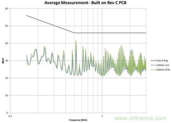 圖4是修改后的效果圖。我們在故障點位置為EMI規范獲得了大約6dB的裕量。此外,我們還顯著減少了總體EMI簽名。所有這些改善都僅僅是因為布局的調整,并未改變電路。如果您的電路具有高電壓開關并使用了屏蔽距離,您需要非常小心地對其進行控制。