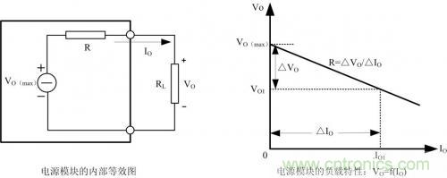 圖 1為電源模塊的內(nèi)部等效與輸出負載特性曲線:VO=f(IO),R為模塊的輸出阻抗(包含導線電阻和接觸電阻等),空載時,模塊輸出電壓為最大值VO(max)。當負載電流變化△IO時,負載電壓變化量為△VO,△VO=R*△IO,R*△IO也表示模塊的負載調整率。負載電壓VO與負載電流IO的關系可表示為: