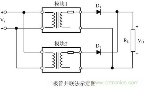 圖 4是電源輸出二極管并聯(lián)法,在兩組模塊輸出端先分別串接二極管D1、D2,然后再并聯(lián)。此種方案與電源輸出電阻并聯(lián)法原理相同,優(yōu)點在于可以利用二極管防止不同電源模塊的輸出電流逆流到另外一個模塊,形成內(nèi)環(huán)流。