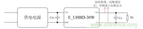 根據數據手冊要求連接E2405UHBD-30W電源模塊外圍電路,負載使用電子負載儀加滿載,供電電源使用可編程直流電源。模塊上電,電子負載儀上顯示的電壓值不是5.0V,而是4.7V,然而在測量電源模塊輸出引腳兩端的電壓值是5.0V。什么原因呢?E2405UHBD-30W模塊滿載時,輸出電流有6A,而模塊引腳到負載儀端口之間的連接線太長了,使得連接線的阻抗值大。如果阻抗為0.05歐姆,那么連接線上的電壓差為0.05Ω*6A=0.3V,這個就是模塊輸出引腳到負載儀端口的壓差。