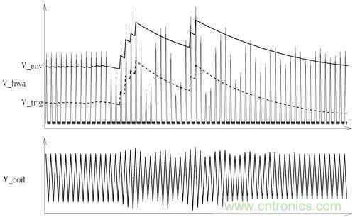 OPA2輸出訊號再傳送到D601、R612、C612為一檢波電路,參考圖6中經過D601訊號為V_env該訊號為波峰訊號之檢波結果,但該訊號之直流穩態非固定值,所以在透過C613、R614、R615構成之去交連耦合電路得到之波形為V_trig,而該波型最后傳到TX-U1進行解碼處理,在圖6中能看到原供電線圈上之訊號V_coil轉換到V_trig之差異。