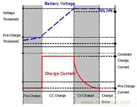 因鋰離子電池的特性,若鋰離子電池在充電之前已深度放電,此時充電器會先以微弱電流對電池進行Pre-Charge充電(各家廠商設(shè)定值不同,本文使用范例的充電IC設(shè)定值約為10%的最大充電電流),充電時電池電壓上升。