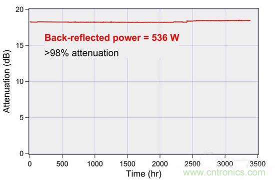 因為工件表面的不規則、與表面法線對齊不精確以及處理光學元件采光角度的限制,典型的回返激光通常只占一小部分激光器的功率,此外,回返現象通常持續時間很短,例如打孔這樣的應用。但是,部分光纖激光器的設計會導致難以處理甚至無法處理反射材料。回返造成的損傷通常是由于光功率在聚合物材料上能量堆積而導致過熱或燃燒引起的。nLIGHT altaTM光纖激光器會剝除耦合到饋送光纖的回返光,并將其引導到水冷光束吸收器,激光在此被轉換為熱量,不涉及任何聚合物,從而消除了主要的損壞原因。無聚合物的隔離器旨在連續吸收消除>500 W的回返激光,如壽命測試所示。