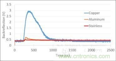 (圖片說明:在進行不銹鋼、鋁和銅金屬板打孔時從工件返射的激光信號示例。)