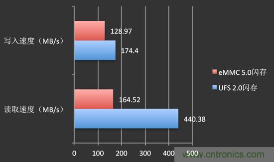 通過上面的測試,大家能夠看到,UFS 2.0閃存智能終端產(chǎn)品的讀取速度一般都能夠達(dá)到400MB/s以上,而寫入速度則在100MB/s以上。換句話說,大小為5MB左右的MP3歌曲,UFS 2.0閃存一秒即可寫入20首以上,夠不夠快呢?另外,這樣的速度究竟處于怎樣的水平?相比時下常見的eMMC 5.0閃存解決方案,優(yōu)勢究竟有多少呢?我們還是用數(shù)據(jù)來說話。