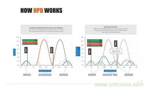雖然發動機制動設計效果顯著,但是增加的車輛總重、車輛較低的滾動阻力和低排量發動機都要求更強的輔助制動功率,Jacobs的解決方案是高功率密度HPD 發動機制動系統。在高功率密度發動機制系統中,橋接器、控制閥和液壓執行機構都與常規裝置系統,共同應用到進氣凸輪。驅動階段發動機保持四沖程模式,制動 階段發動機切換到兩沖程模式,從而制動沖程的數量加倍。Jacobs解決方案能夠更高效地利用渦輪增壓器,控制其最優化制動充壓效果。