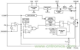 嵌入式高壓(HV)啟動電路包括800V啟動MOSFET晶體管和可開關的高壓電流發生器,其提供的電流ICH 為連接VCC引腳的外部電容CVCC充電。當VCC電壓達到啟動閾壓8V時,芯片開始工作,一次側MOSFET開關開始運行,高壓電流發生器關閉。