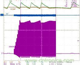 在啟動階段,若IDRAIN 在tONMIN時間內升至較高值,則脈沖跨周調制模式激活,以降低芯片的開關頻率(圖9),為電感提供更多的放電時間,幫助限制漏極峰流值,防止電流失控現象發生,避免變壓器出現飽和,提高系統總體可靠性。