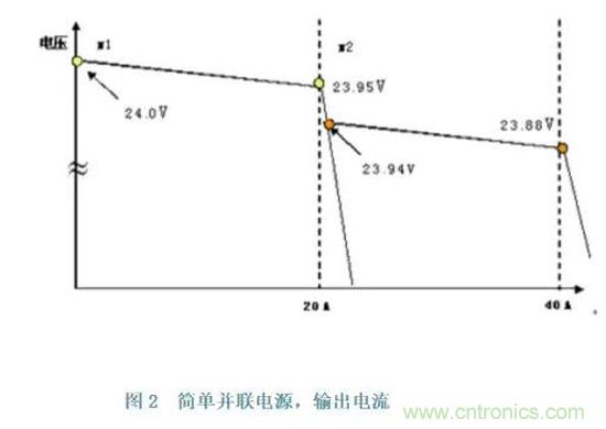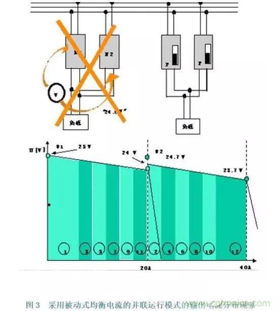 被動式均衡電流的并聯運行模式特點是:當輸出電流增大時,其輸出電壓會微量的減少,其輸出電壓是所謂的軟特性:輸出電壓隨著輸出電流的增加而稍微下降。其電源在空載到滿負載之間的輸出電壓的波動大約為4%~5%額定電壓即1V左右。這樣當二個電源并聯時,由于不同的電流負載產生了不同的輸出電壓,一個是有稍高輸出的電壓的電源首先承受負載電流,隨著電流量的增加,這個電源輸出電壓略降,低于另一個電源的輸出電壓,這樣另一電源承受負載電流,通過這樣階梯式交替的方法達到均衡電流的作用。均衡電流的平衡程度如何,取決于所有并聯電源的輸出電壓的初始調節和設置值。必需指出,這個方法的實現其輸出電源必須采用一個共同的接線端。