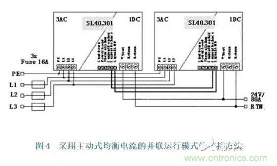 主動式均衡電流的并聯模式必須采用一根附加的均流線,這根均流線作為反饋信號傳送到電源的控制器來調節每個電源在所有的條件下提供相同的輸出電流,這時,電源電壓輸出的軟特征是不需要的,輸出電壓在任何場合下不受電流大小的影響,所以與被動式均衡電流相比,其輸出電壓精度高,同時與輸出電路的類型無關;但是對于開發和安裝來說,費用較高,因為在電源內部需要一個精確度較高的電流測試線路和一個附加的電流調節器,同時也多一個接線端口。PULS電源的SL40.301三相24/40A的電源采用這種技術,所有的電源經過均流線和地線相連接,如圖4所示。