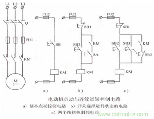 在圖c中,沒有斷路器,取而代之的是一個機械互鎖開關SB3。當按下按鈕SB2時,接觸器線圈通電,常開觸點KM閉合,電動機啟動,松開后,由于常開觸點依然閉合,因此電動機正常運轉。按下按鈕SB3時,接觸器常開觸點下方的按鈕常閉觸點SB3斷開,同時按鈕SB3常開觸點閉合,電動機啟動,松開后電動機停止(接觸器常開觸點此時未接入電路)。因此,此電路可在電動機連動的時候,直接按下SB3,變成點動。