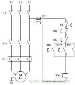 有了點動和連動的知識,這個圖中接觸器KM的作用就不必多說了。圖中SB11和SB21為停止按鈕,SB12和SB22為啟動按鈕。其中把任意一個啟動按鈕和停止按鈕安裝在同一個按鈕箱內,另外兩個也安裝在另外一個按鈕箱內。兩個按鈕箱可分別放在控制室和電動機旁。