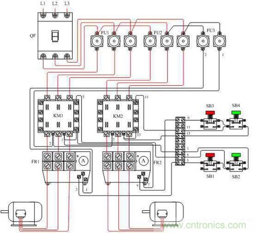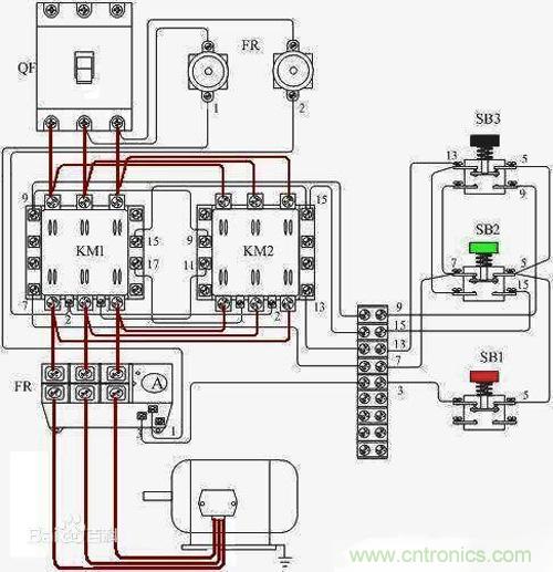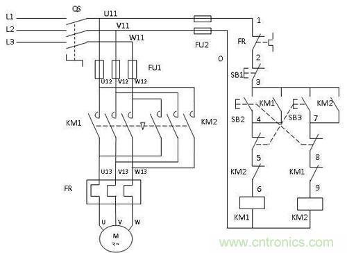 注意看左側的主回路,三項電L1,L2,L3通過接觸器KM1到達電動機M1的順序為左、中、右;而通過接觸器KM2到達電動機M1的順序為右、中、左。相序的改變實現了電機運轉方向的改變。這一用法用在電動汽車或電動三輪車上,即可實現倒車的功能。現在有一種更方便的元件,叫做“倒順開關”,其原理便是如此。