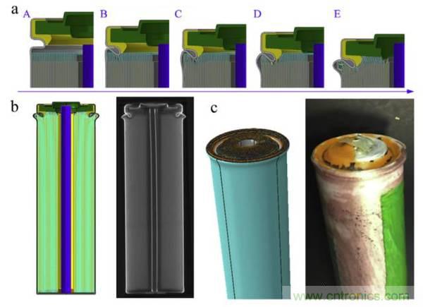 美國麻省理工學院的Juner Zhu等人利用18650電池研究了在發生軸向擠壓的過程中鋰離子電池的發生熱失控的機理,并利用有限元分析模型進行了仿真分析,該模型還原了不同的軸向壓力對鋰離子電池造成的影響,分析結果得到了CT掃描的驗證,該仿真分析結果發現了兩種可以解釋在擠壓試驗中導致鋰離子電池發生短路原因。