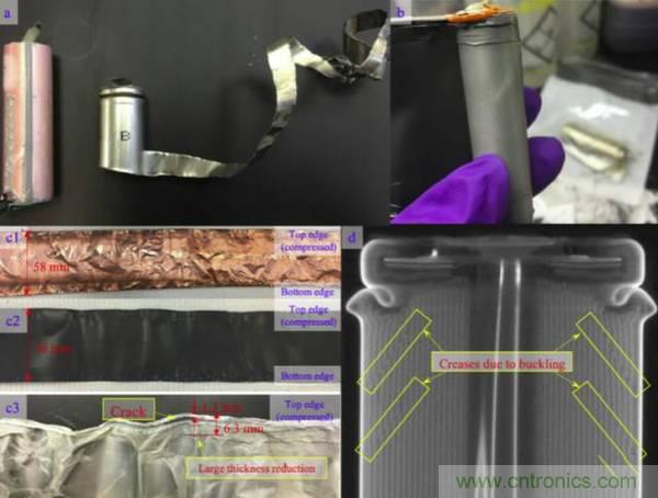 對試驗后的18650電池進行拆解顯示,雖然電芯發生了嚴重的變形,但是正負極并沒有發生斷裂,反而是隔膜在距離上部邊緣1.3mm的位置出現了一個裂縫,這直接導致了電池發生短路,電壓突降,而這一裂縫可能是由于金屬箔鋒利的邊緣侵入造成的。此外隔膜的在一些位置厚度出現了很大的下降,這主要是由于凹陷的外殼擠壓電芯造成的。