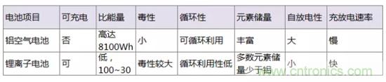 鋁空氣電池與現今的鋰離子電池相比的優劣如下表所示。