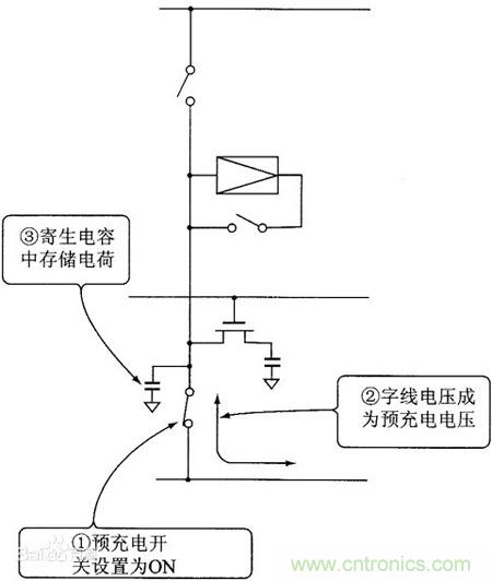 寫操作時,寫選擇線為“1”,所以Q1導(dǎo)通,要寫入的數(shù)據(jù)通過Q1送到Q2的柵極,并通過柵極電容在一定時間內(nèi)保持信息。