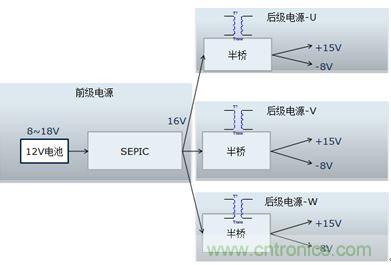 該電源的輸入是新能源乘用車常規(guī)的12V電源,該電源通常波動范圍是8~16V,而驅(qū)動電源的輸出需要相對穩(wěn)定。需要設計多組寬壓輸入、定壓輸出的隔離電源。本設計把電源分成兩級:前級電源實現(xiàn)寬壓輸入、定壓輸出功能,后級實現(xiàn)隔離功能,結構見圖1.