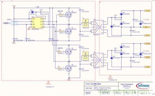 前級電源屬于典型定壓設計,無需給出設計原理,本文重點介紹后級半橋電路。具體原理圖見圖2和圖3。圖2為采用汽車級定時器電路設計的50%占空比信號發(fā)生器,用于給半橋開關電源提供控制信號,其中R49可以用來調(diào)整開關頻率,一般可以設定在70kHz到300kHz之間,頻率選擇主要根據(jù)電路板實際空間尺寸和變壓器的伏秒積進行折衷選取。