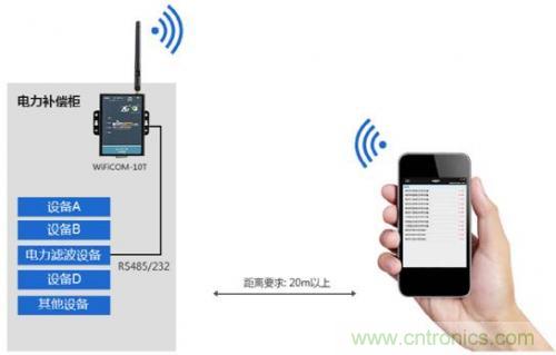電力補償裝置的巡檢一般需要人工開柜進行數據的查看、調整等操作,工作繁瑣切具有一定危險性,本項目利用WiFiCOM-10T串口轉Wi-Fi模塊,在傳統裝置的基礎上利用原有的RS-485/232通訊接口快速進行產品升級,將串口數據轉化成Wi-Fi信號,巡檢人員即可通過手機或iPad進行設備巡檢,并實現遙控、遙測、遙信等功能。