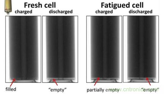 鋰離子電池主要由正極、負極、隔膜和電解液,以及結構件等部分組成,在鋰離子電池的外部,通過導線和負載等,將負極的電子傳導到正極,而在電池內部,正負極之間則通過電解液進行連接,在放電的時候,Li+通過電解液從負極擴散到正極,嵌入到正極的晶體結構之中。所以在鋰離子電池中,電解液是非常重要的一環,對鋰離子電池的性能有著重要的影響。理想的情況下,正負極之間應該有充足的電解液,在充放電的過程中都應該具有足夠的Li+濃度,從而減小由于電解液的濃差極化造成的性能衰降。但是在實際充放電過程中,受制于Li+擴散速度等因素,在正負極會產生Li+濃度梯度,Li+濃度隨著充放電而波動。由于結構設計和生產工藝等原因,還會導致電解液在電芯內部的分布不均勻,特別是在充電的過程中,隨著電極的膨脹,會在電芯的內部形成部分“干區”,“干區”的存在導致了能夠參與到充放電反應中的活性物質減少,引起電池內局部SoC不均勻,從而導致電池內局部老化速度加快。M.J. Mu hlbauer在研究鋰離子電池老化對Li分布的影響中曾發現,由于在充放電過程中,正負極極片都存在一定體積膨脹,導致電芯也存在一定程度的體積膨脹和收縮,電芯會如同“呼吸”一般,反復的“吸入”和“吐出”電解液,所以不同時刻,電解液在電芯內的浸潤情況也在實時變化(如下圖所示)。