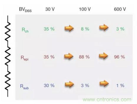 圖2顯示平面式MOSFET情況下構成RDS(on) 的各個分量。對于低壓MOSFET,三個分量是相似的。但隨著額定電壓增加,外延層需要更厚和更輕摻雜,以阻斷高壓。額定電壓每增加一倍,維持相同的RDS(on)所需的面積就增加為原來的五倍以上。對于額定電壓為600V的MOSFET,超過95%的電阻來自外延層。顯然,要想顯著減小RDS(on)的值,就需要找到一種對漂移區(qū)進行重摻雜的方法,并大幅減小epi電阻。