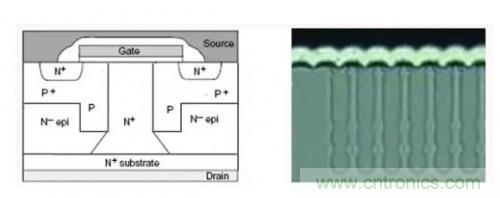 通常,高壓的功率MOSFET采用平面型結構,其中,厚的低摻雜的N-的外延層,即epi層,用來保證具有足夠的擊穿電壓,低摻雜的N-的epi層的尺寸越厚,耐壓的額定值越大,但是其導通電阻也急劇的增大。導通電阻隨電壓以2.4-2.6次方增長,這樣,就降低的電流的額定值。為了得到一定的導通電阻值,就必須增大硅片的面積,成本隨之增加。如果類似于IGBT引入少數(shù)載流子導電,可以降低導通壓降,但是少數(shù)載流子的引入會降低工作的開關頻率,并產(chǎn)生關斷的電流拖尾,從而增加開關損耗。