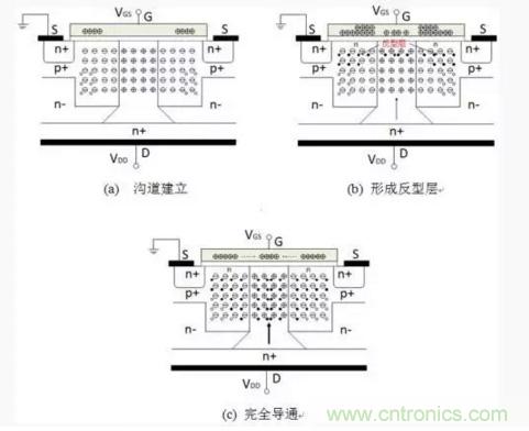 當G極加上驅動電壓時,在G極的表面將積累正電荷,同時,吸引P區(qū)的電子到表面,將P區(qū)表面空穴中和,在柵極下面形成耗盡層,如圖5示。隨著G極的電壓提高,柵極表面正電荷增強,進一步吸引P區(qū)電子到表面,這樣,在G極下面的P型的溝道區(qū)中,積累負電荷,形成N型的反型層,同時,由于更多負電荷在P型表面積累,一些負電荷將擴散進入原來完全耗盡的垂直的 N+,橫向的耗盡層越來越減小,橫向的電場也越來越小。G極的電壓進一步提高,P區(qū)更寬范圍形成N型的反型層,最后,N+區(qū)域回到原來的高滲雜的狀態(tài),這樣,就形成的低導通電阻的電流路徑,如圖5(c)所示。