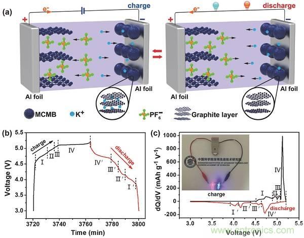 近日,中科院深圳先進技術研究院唐永炳研究員(通訊作者)課題組在Adv. Energy Mater.上發表了一篇名為“A Dual-Carbon Battery Based on Potassium-Ion Electrolyte”的文章。研究人員開發了基于鉀離子電解液的新型雙碳電池(命名為K-DCB),其中中間相碳微球作為負極材料,膨脹石墨作為正極材料。實驗人員研究了K-DCB的工作機理:充電時,K+運動到石墨負極并嵌入到石墨層間形成插層化合物,同時PF6-運動到正極,插層到中間相碳微球的層間;放電時則相反。結果表明,該K-DCB在3.0~5.2V的電壓窗口范圍,1C的電流密度下可以提供61mAh g-1的可逆比容量,并且具有良好的循環性能,循環100次后容量幾乎無衰減。此外,該K-DCB具有較高的放電中值電壓(4.5V),能夠滿足一些高電壓設備的要求。K-DCB具有環保、成本低、能量密度高等優點,對未來能源儲存應用極具潛力。