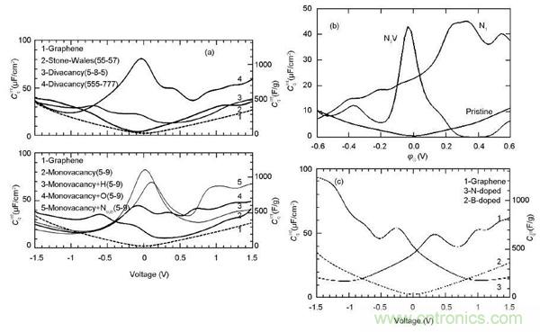 圖4.不同結構石墨烯量子電容:(a) 缺陷石墨烯;(b) N摻雜石墨烯;(c) N、B摻雜石墨烯