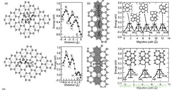 計算表明,Li在完整石墨烯表面的擴散勢壘是0. 32 eV,表明Li易沿著石墨烯表面擴散,利用石墨烯作為負極時往往具有良好的倍率性能。科學家的計算結果表明,當Li在完整石墨烯上沿著六元環中心頂部—C—C鍵中間六元環中心頂部路徑擴散時,最高的能量阻礙在Li跨過C—C鍵的位置,能量勢壘為0. 311 eV;沿著六元環中心頂部—C原子頂部六元環中心頂部擴散時,C原子頂點為能量壁壘,0. 337 eV。當Li在兩層石墨烯的層間擴散時,同樣具有較低的擴散能壘。