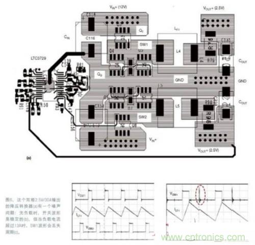 圖6和圖7(略)提供了一個同步降壓電路的例子,它強調了去耦電容的重要性。圖6a是一個雙相12VIN、2.5VOUT/30A(最大值)的同步降壓電源,使用了LTC3729雙相單VOUT控制器IC.在無負載時,開關結點SW1和SW2的波形以及輸出電感電流都是穩定的(圖6b)。但如果負載電流超過13A,SW1結點的波形就開始丟失周期。負載電流更高時,問題會更惡化(圖6c)。