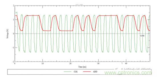 為方便計算,我們假設DDR的時鐘頻率為500MHz,這樣對應的地址信號的速率就應該是500Mbps,這里大家應該明白,雖然DDR是雙倍速率,但對于地址/控制信號來說,依然是單倍速率的。下面來看看波形,在地址與時鐘完全等長的情況下,地址與數據端的接收波形如下圖2,紅色代表地址信號,綠色代表時鐘信號。