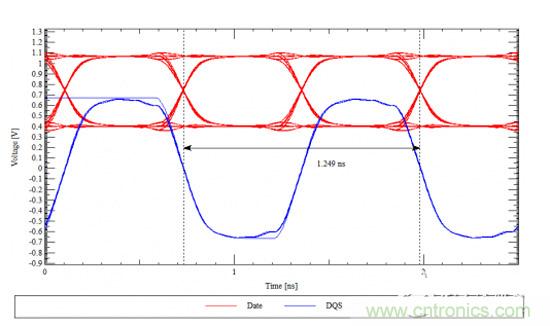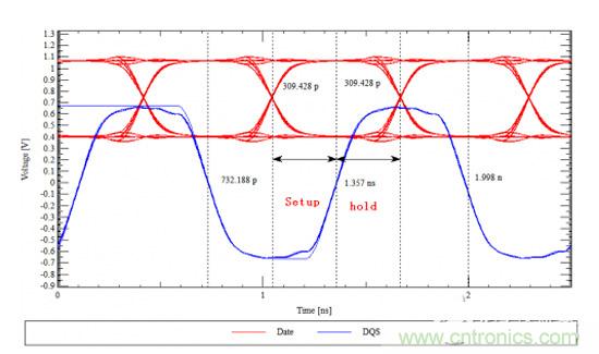 由上圖可知,在地址信號比時鐘信號長的情況下,保持時間為684ps,建立越為1.1ns。可見,相對于地址線與時鐘線等長來說,地址線比時鐘線長會使地址信號的建立時間更短。同理,如果時鐘線比地址線長,則建立時間會變長,而保持時間會變短。那么雙倍速率的數據信號又是怎樣的?下面通過具體的仿真實例來看一下。