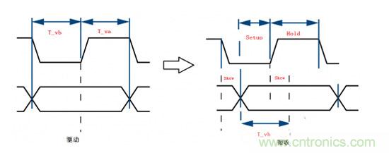 上圖中,T_vb與T_va表示的是主控芯片在輸出數據時時鐘與數據之間的時序參數。在理想情況下,時鐘邊沿和數據電平的中心是對齊的,由于時鐘和數據傳輸通道不等長,使得時鐘邊沿沒有和數據脈沖的中間位置對其,使得建立時間的裕量變小。在理解了這些基礎問題之后,我們需要做的就是將這些時間參數轉化為線長。