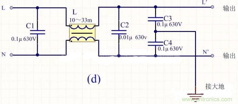 為降低成本和減小體積,開關電源一般采用簡易的EMI濾波器,主要包括共模扼流圈L和濾波電容,以下四種可以根據情況進行選擇: