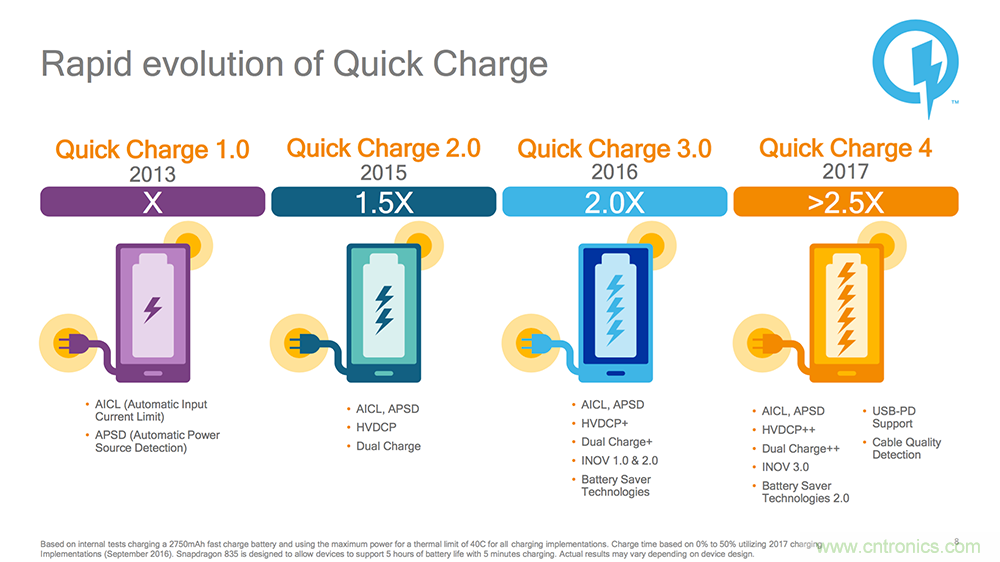 早在 2013 年,高通就意識到了“快充”對智能手機的重要性,當時就推出了 Quick Charge 1.0 標準,通過提高輸入電流來提高充電效率,讓搭載驍龍 600 處理器的手機支持“5V 2A”充電。