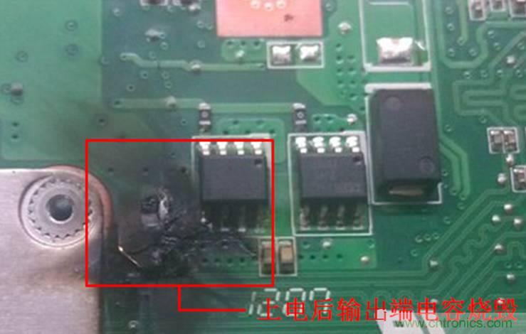 較于上一種電源模塊損壞的情況而言,更可怕的情況就是,不僅壞了電源甚至把整個電路都燒毀了。具體的現象就是電源模塊剛上電就燒毀冒煙了,輸入端的電容炸裂,如圖3所示,這一類問題是最為嚴重的,需要在前期設計中盡量避免,那么若是已經發生了這一情況,它到底是什么原因導致的呢?具體如下所示: