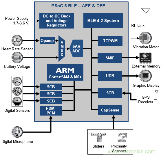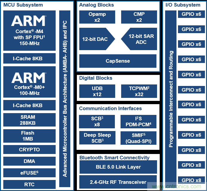 擴充處理器容量、內存及功耗方面的性能不會憑空而來。對于許多應用程序而言,底層硬件(例如MCU)需要做出相應調整以適應這些特性。因此,生產商在設計下一代MCU時必須時刻緊記這些要求。例如,賽普拉斯 PSoC 6 BLE MCU(見圖1)為物聯網設計人員提供BLE 5.0所具備的這些功能。