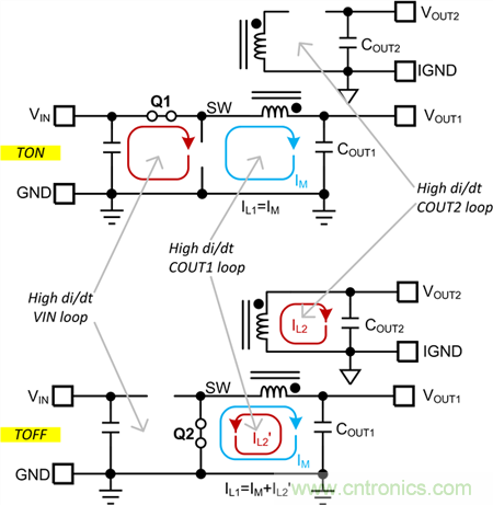 Fly-Buck 轉(zhuǎn)換器的一次側(cè)看上去與降壓轉(zhuǎn)換器類似,如圖 2 所示。這里的 VIN 環(huán)路與降壓轉(zhuǎn)換器一樣,也是高 di/dt 環(huán)路。然而,VOUT1 環(huán)路的電流與降壓轉(zhuǎn)換器有很大不同。除了一次電感器磁化電流外,該環(huán)路還包含來(lái)自二次繞組的反射電流。反射電流只含有其路徑中耦合電感器的漏電感,因此 di/dt 明顯高于電感器磁化電流。所以盡量減小 VOUT1 環(huán)路的環(huán)路面積也非常重要。同樣的道理,包含二次電感器繞組、整流器二極管以及二次輸出電容器的二次輸出環(huán)路也需要最小化,因?yàn)槔锩嬗懈?di/dt 電流流過(guò)。