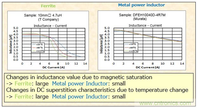 同時,針對溫度的變化,金屬合金粉材質的電感衰減比鐵氧體要緩慢很多。