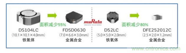 同等特性時(感值、飽和電流等),金屬合金功率電感比鐵氧體功率電感的外形尺寸小50%左右,可以實現小型化和薄型化。