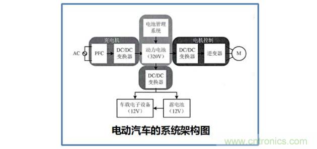 另一方面,DC/DC變換器可以將電動機制動剎車時由機械能轉化而來的電能回饋給蓄電池組,其效率高達85%~95%,遠大于發電機的正常效率。以可控的方式給蓄電池組充電,尤其是在電動汽車需要頻繁啟動和制動的城市工況運行條件下,可以有效地回收制動能量,增加電動汽車的行駛里程。因此,電動汽車采用DC/DC變換器可以優化電動機控制、提高電動汽車的整體效率和性能。下圖為電動汽車的系統架構圖。
