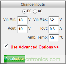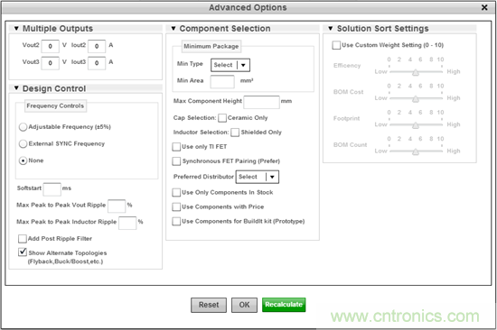 單擊“Use Advanced Options”(使用高級選項)來打開Advanced Options菜單(圖3)。在Design Control(設計控制)項下,確保“Show Alternate Topologies”(顯示替代拓撲)復選框被選中,這樣將列出所有可能的Fly-Buck解決方案。在你確認復選框的選擇后,單擊“Recalculate”(重新計算)按鈕來繼續。