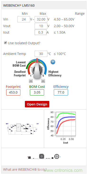 在使用這個WEBENCH控制面板時,輸入針對你的Fly-Buck設計的輸入要求。在打開這個設計之前,確保“Use Isolated Output?”(使用隔離輸出嗎?)復選框被選中。這樣就確保了這個在WEBENCH電源設計工具中創建的設計使用Fly-Buck拓撲,而不是普通的降壓拓撲。