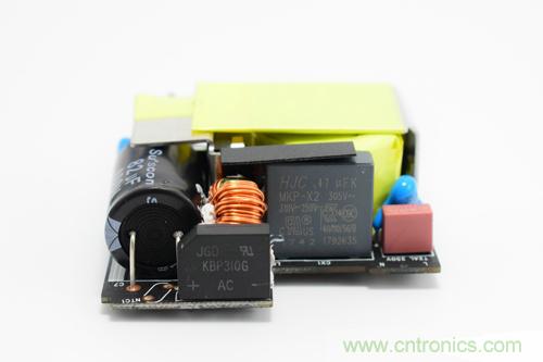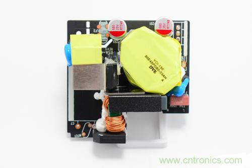 由于沒(méi)有使用SR技術(shù),PCB背面元器件較少,主要是位于左上的 LD5760E,來(lái)自通嘉科技的PWM控制器,與前述的東芝TK10A60W組成一次側(cè)電路。左下方的白色器件為CT1019光耦,用于電壓反饋。