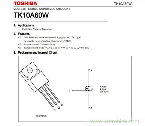 一次側(cè)開關(guān)管為 TK10A60W,N-MOSFET,來(lái)自東芝。