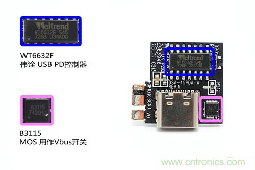 14腳IC為 Weltrend偉詮WT6632F ,來(lái)自偉詮的 USB PD控制器,同時(shí)支持QC2.0和QC3.0協(xié)議。粉色框內(nèi)是絲印為 B3115 的貼片MOSFET,用于Vbus開關(guān)。