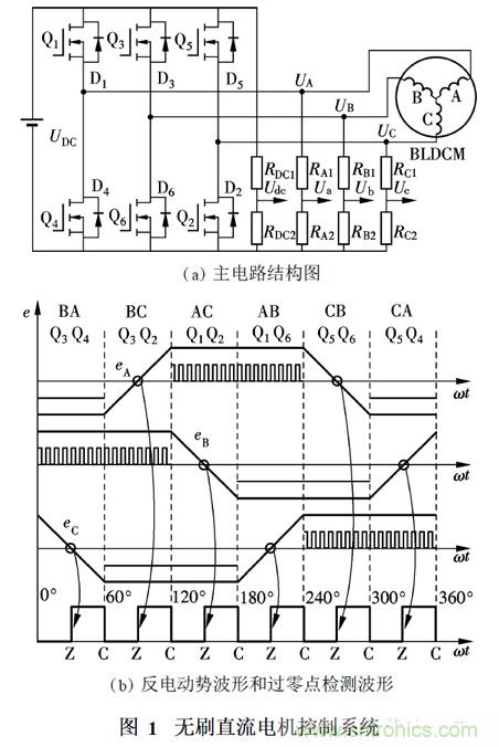理想的反電動勢波形為正負交變的梯形波,且以電機中心點為參考點,圖1 ( b)中, eA , eB , eC 分別表示三相反電動勢. 電機在一個周期內共有6個工作狀態,每隔60°電角度工作狀態改變一次, 每個功率開關導通120°電角度. 工作狀態可以由導通的兩相繞組和2個功率開關表示,如圖1 ( b)所示,BA 表示電流從B 相繞組流入,從A 相繞組流出;Q3Q4 表示B 相上橋臂和A 相下橋臂的2個功率開關導通. 過零點檢測波形表示反電動勢過零點和換相點, 其中, Z為反電動勢過零點, C 為換相點.反電勢過零點和換相點均勻分布,彼此間隔30°電角度.