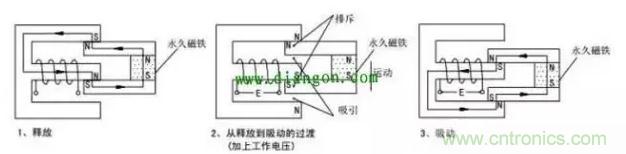 由永久磁鐵保持釋放狀態(tài),加上工作電壓后,電磁感應(yīng)使銜鐵與永久磁鐵產(chǎn)生吸引和排斥力矩,產(chǎn)生向下的運(yùn)動(dòng),最后達(dá)到吸合狀態(tài)。